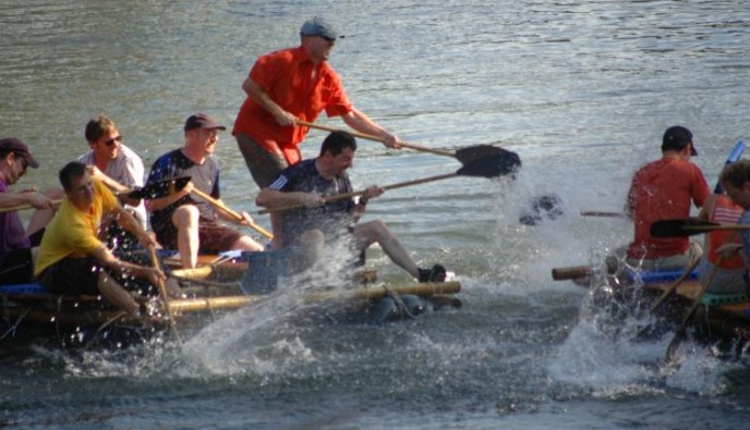Bevor es zur Gaudifahrt geht, müssen die Teilnehmer erstmal das Floß aus Holzstangen, Auftriebskörper und ein Paar Seilen